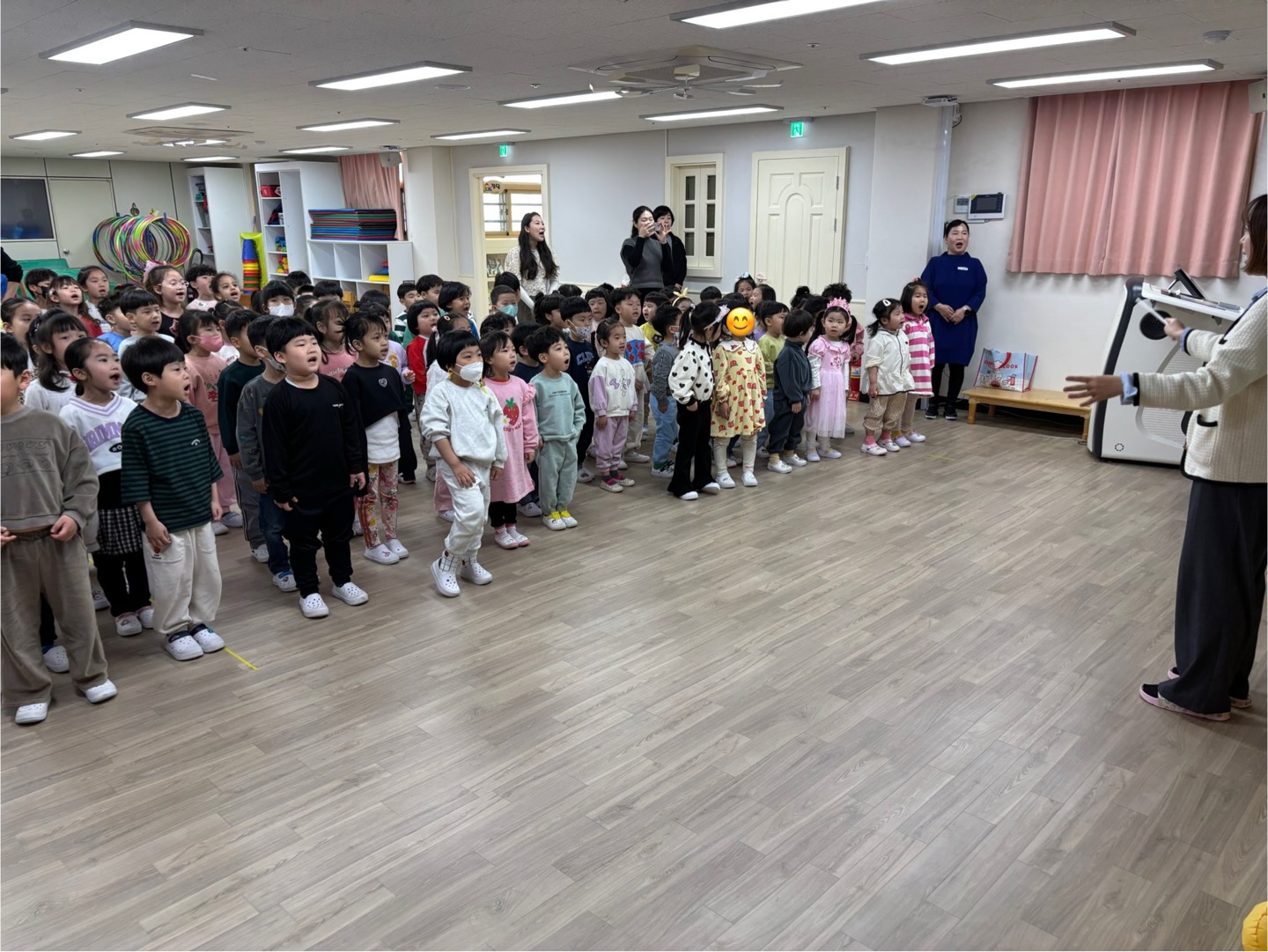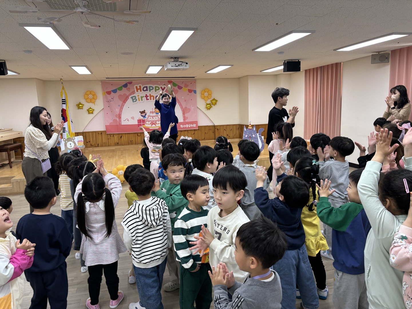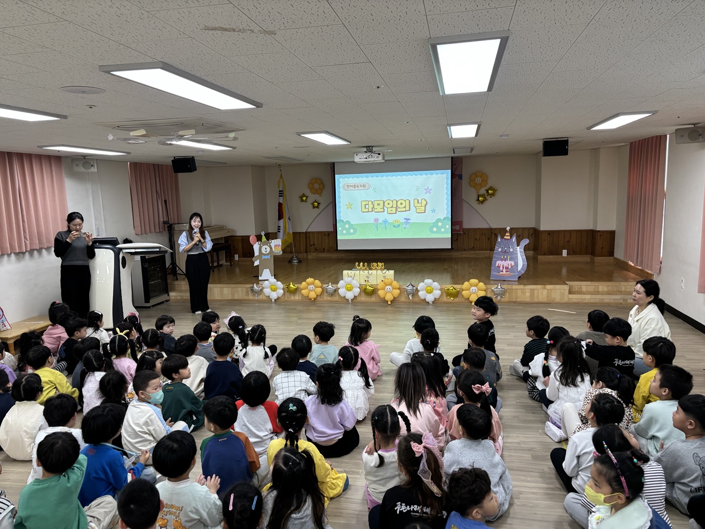 활짝 핀 봄꽃들이 봄맞이를 하고 있는 4월의 유아 다모임~~~^^ 여섯 반 유아들과 서로 인사를 나눈 후 바른 자세로 애국가를 힘차게 불러 보았고, 4월생 생일 친구들에게 생일축하도 해 주었습니다.