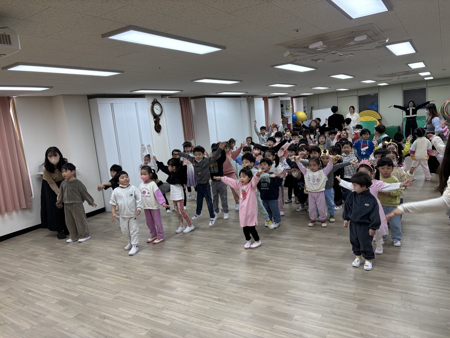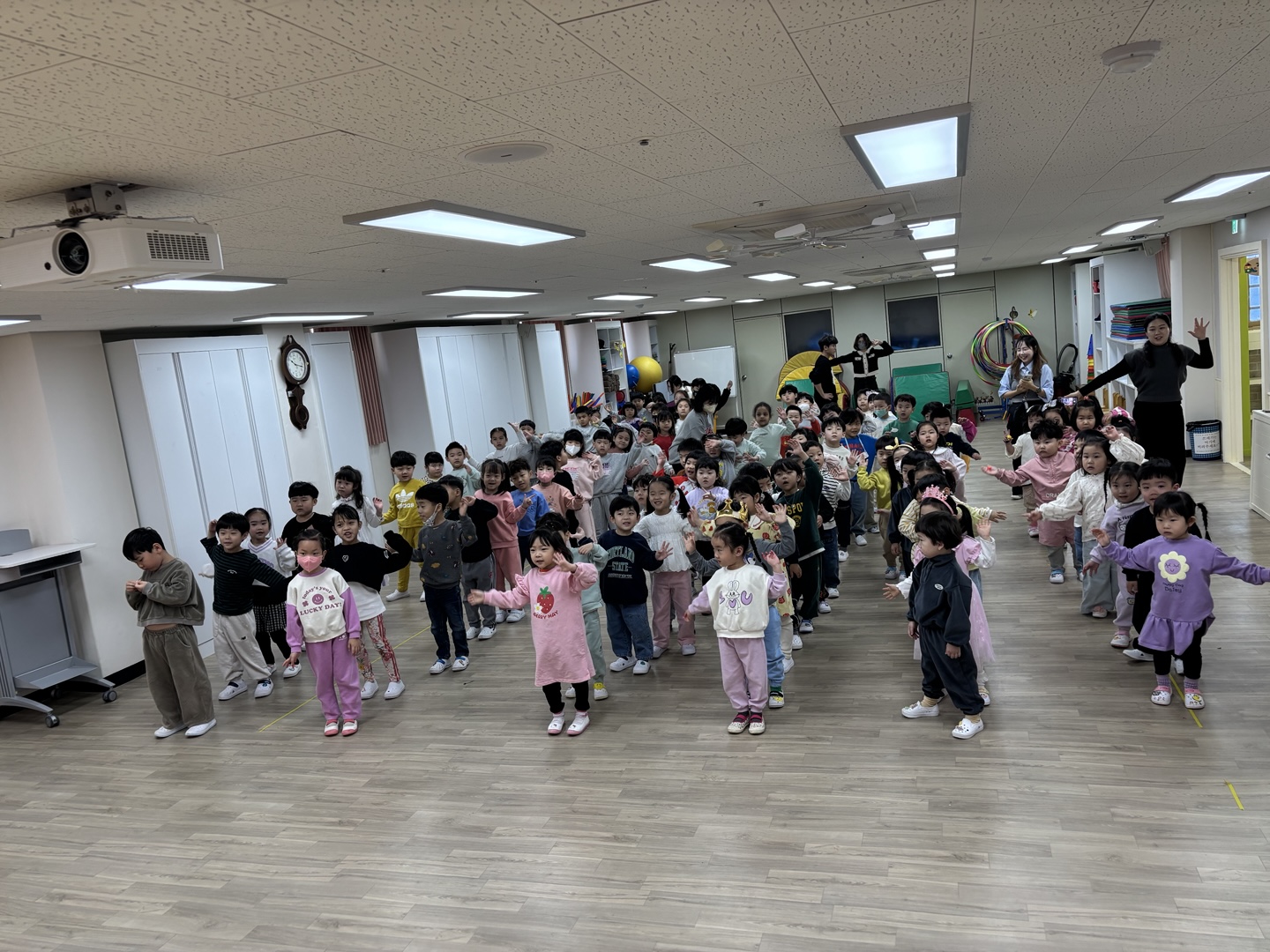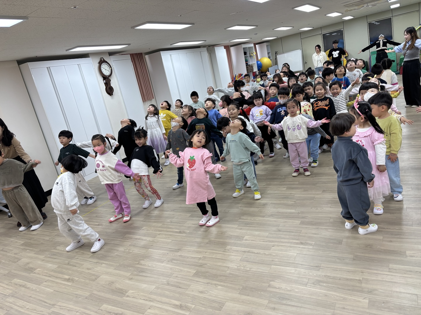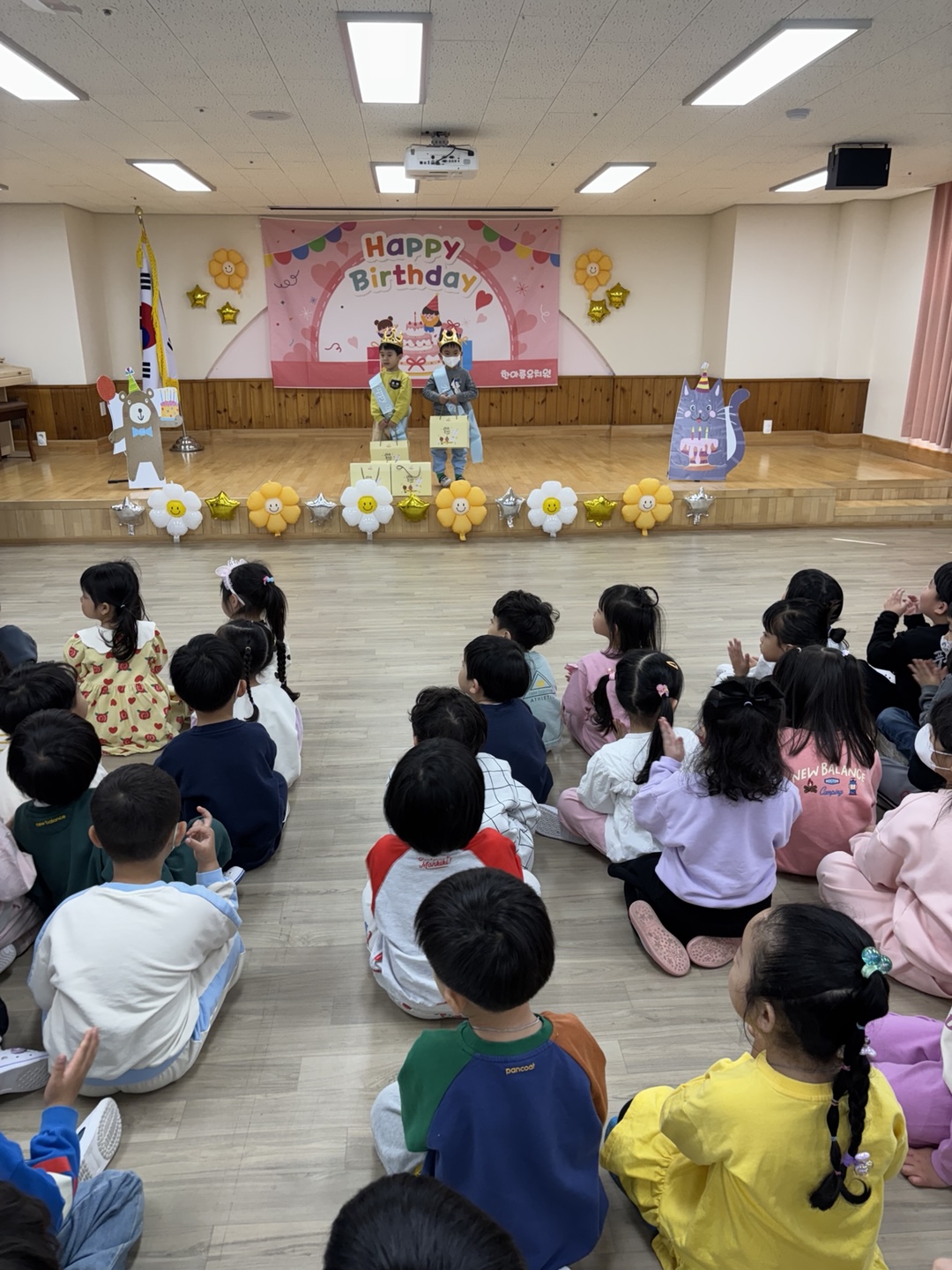 활짝 핀 봄꽃들이 봄맞이를 하고 있는 4월의 유아 다모임~~~^^ 여섯 반 유아들과 서로 인사를 나눈 후 바른 자세로 애국가를 힘차게 불러 보았고, 4월생 생일 친구들에게 생일축하도 해 주었습니다.