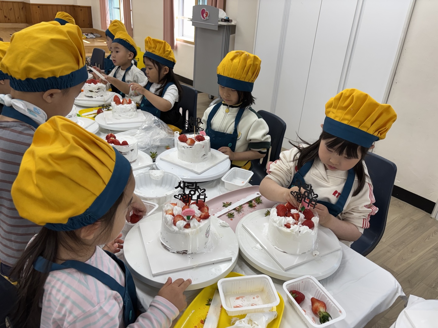 케이크에 생크림을 바르고 과일과 꾸미기 재료로 장식한 후 케이크를 완성시켰어요.