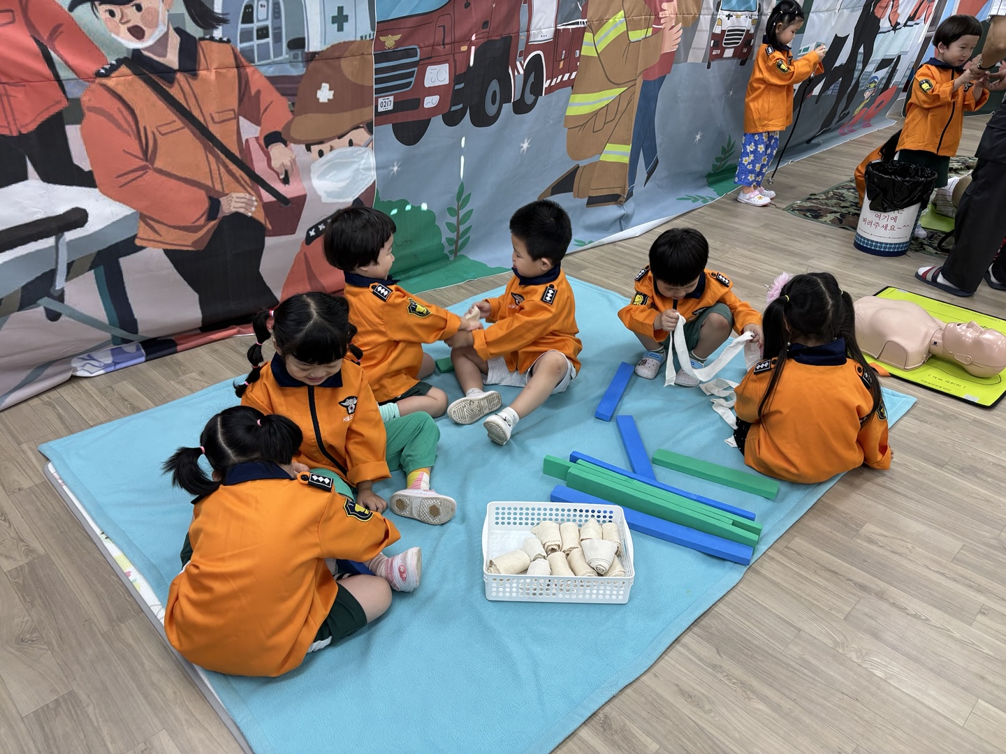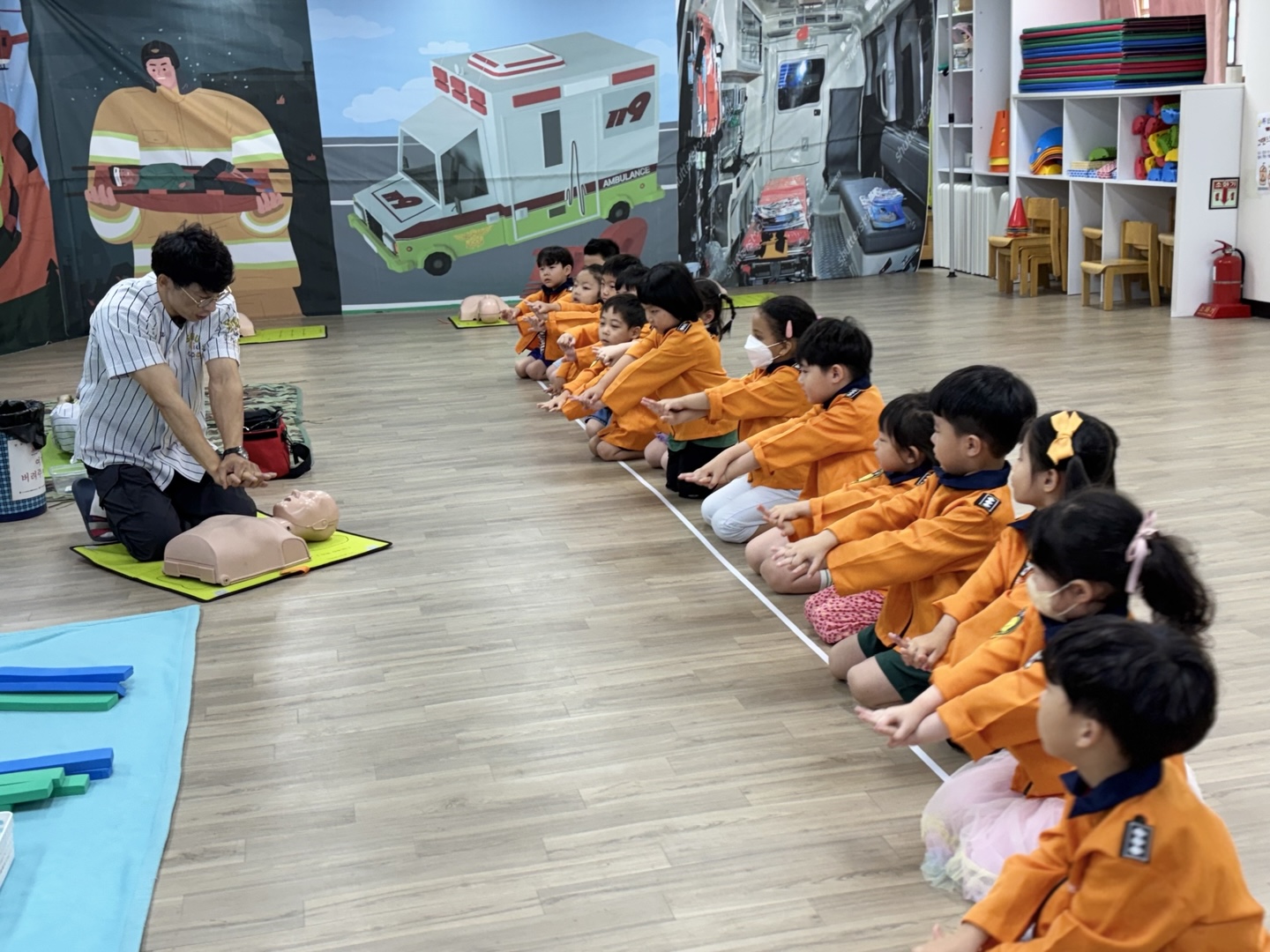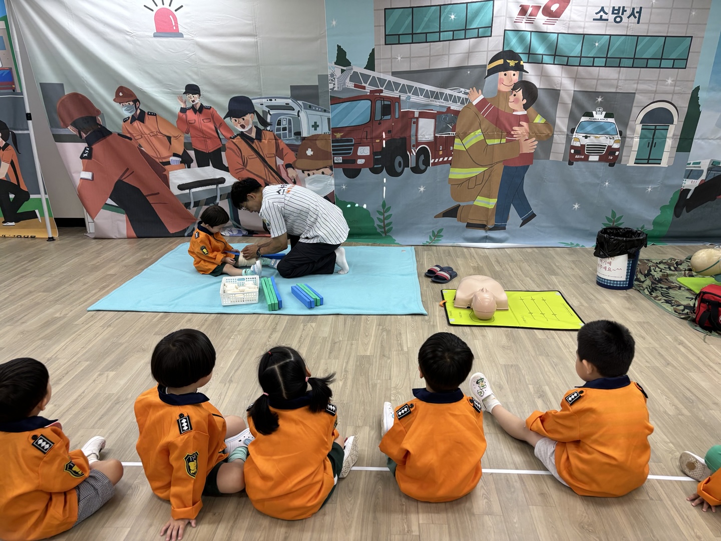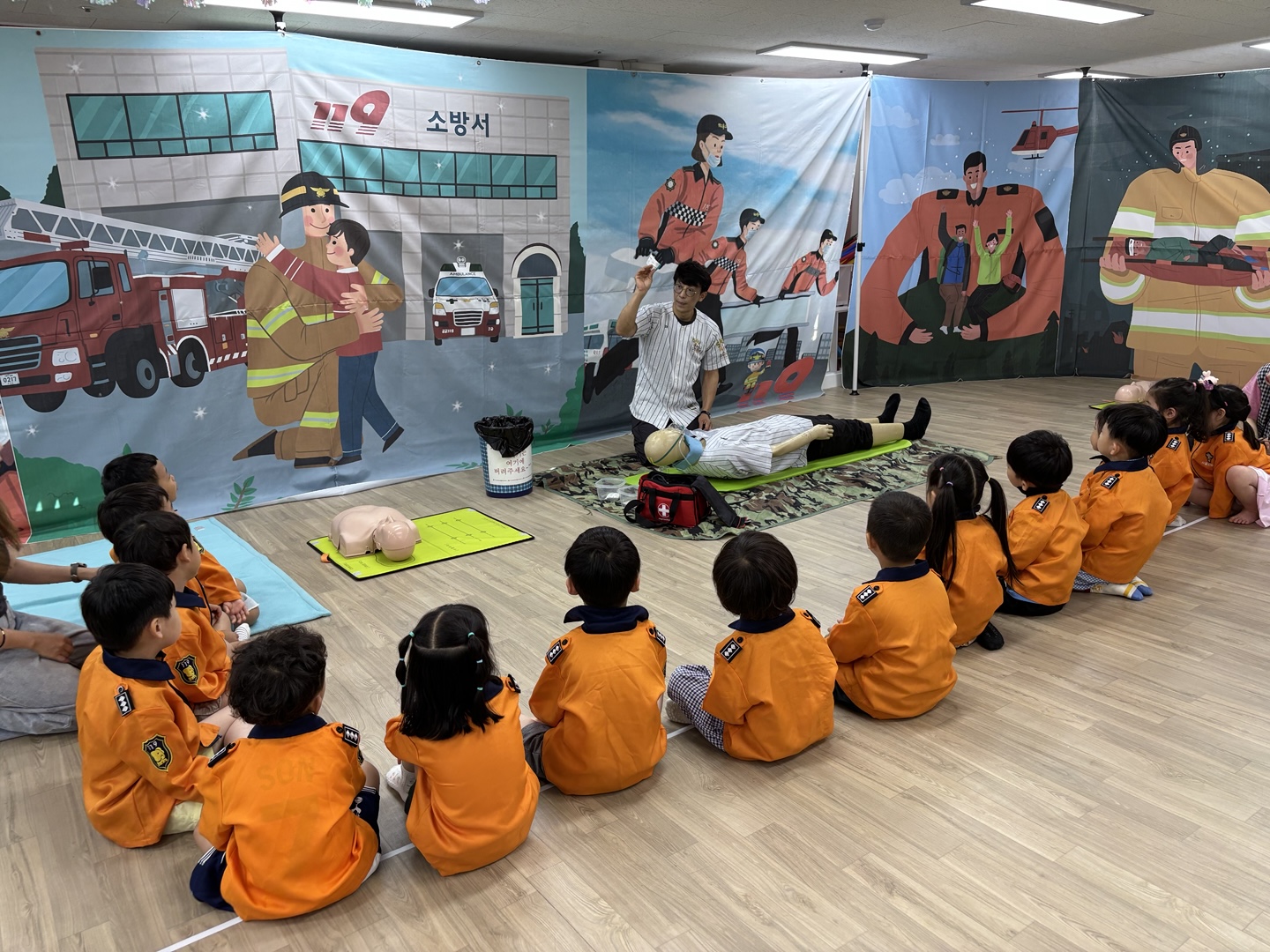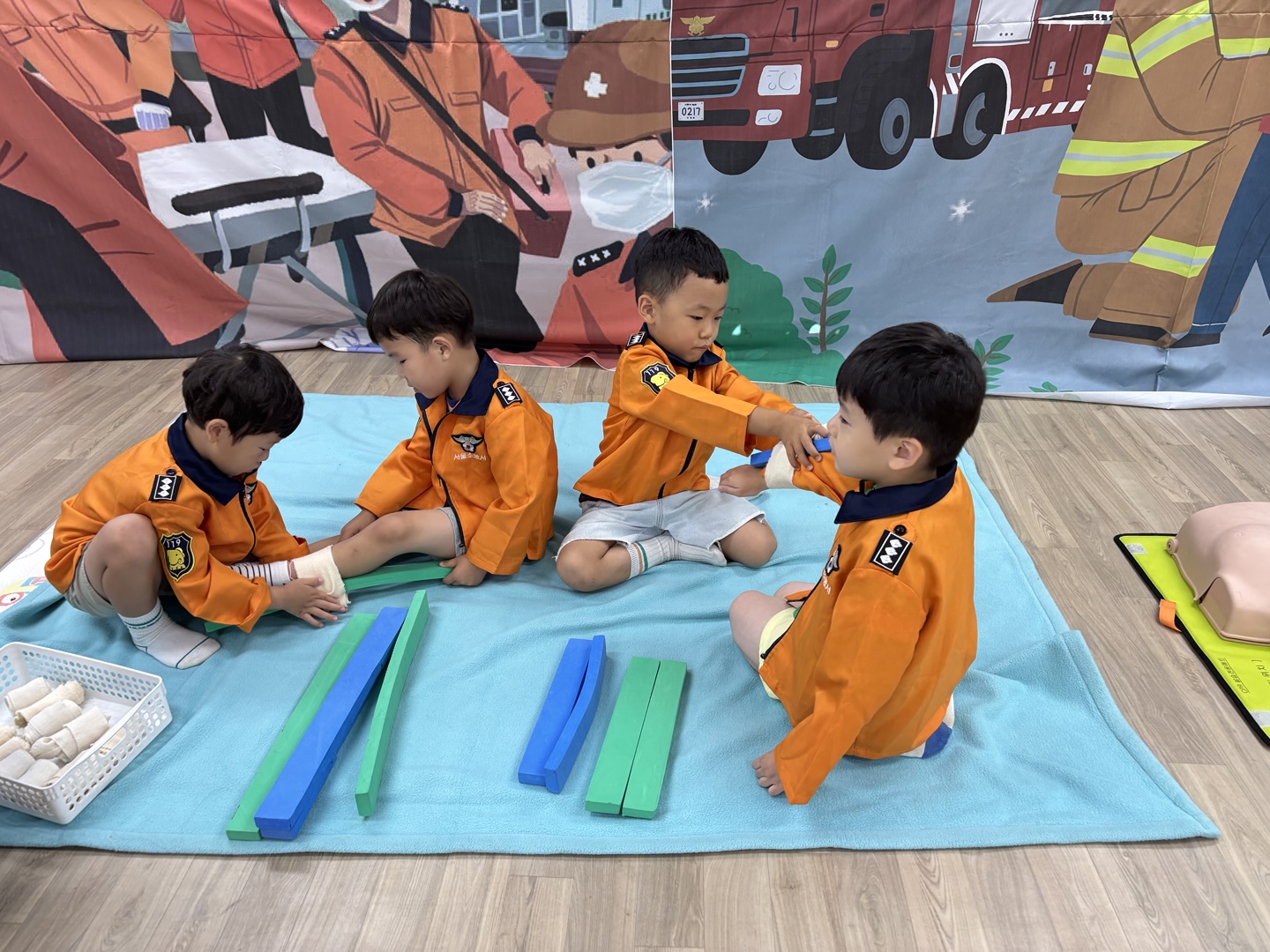 응급구조사 선생님이 직접 유치원을 방문하여 유아들에게 응급구조사의 역할과 응급구조 활동방법을 알려준 후 직접 응급처치, 심폐소생술, 붕대법 등을 경험해 보게 하였습니다.