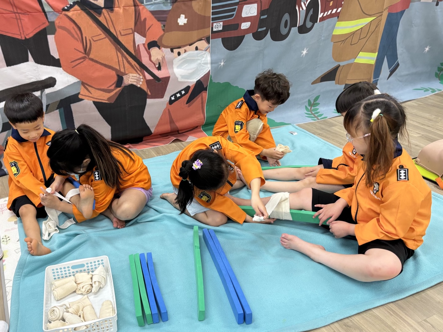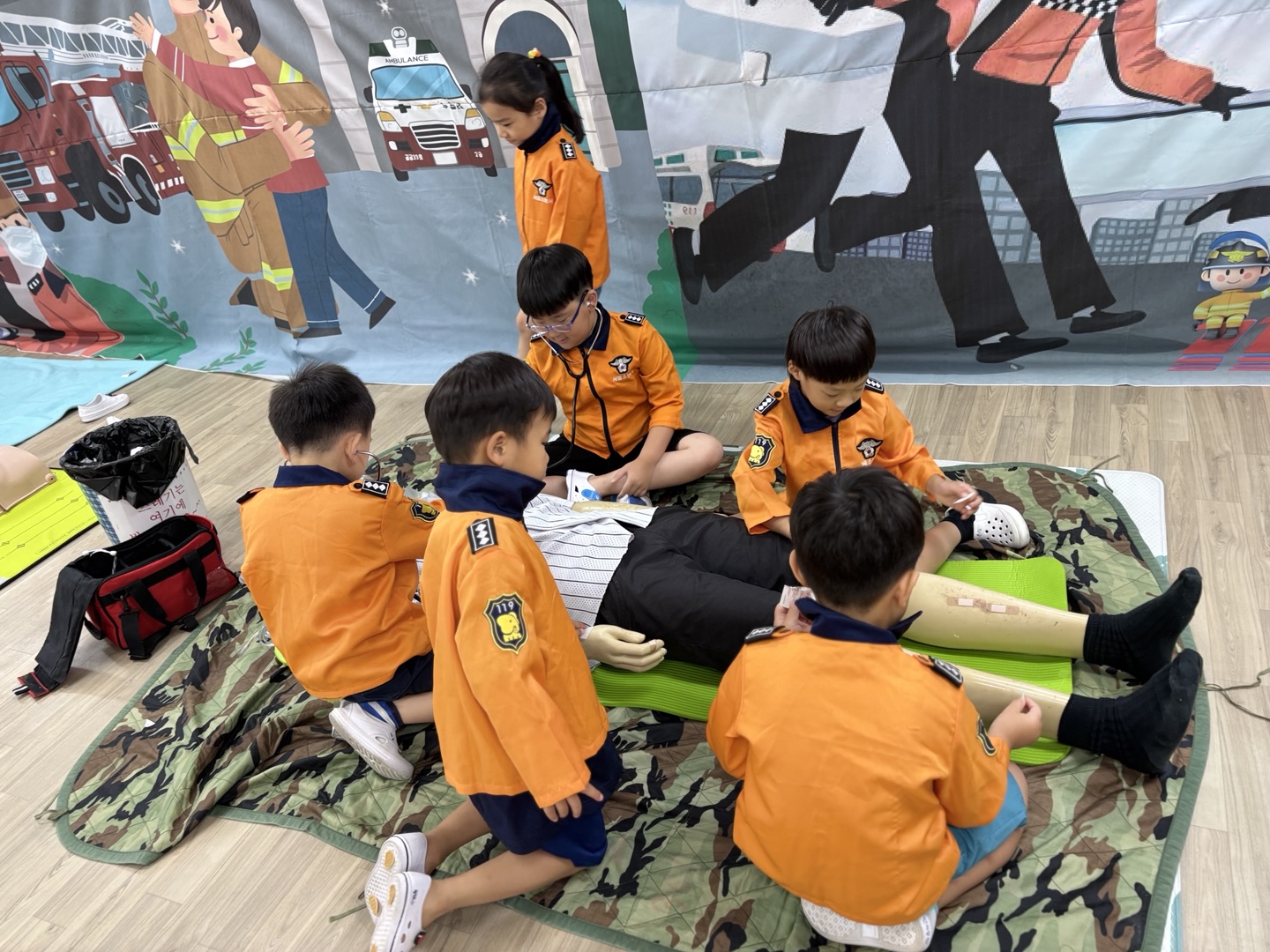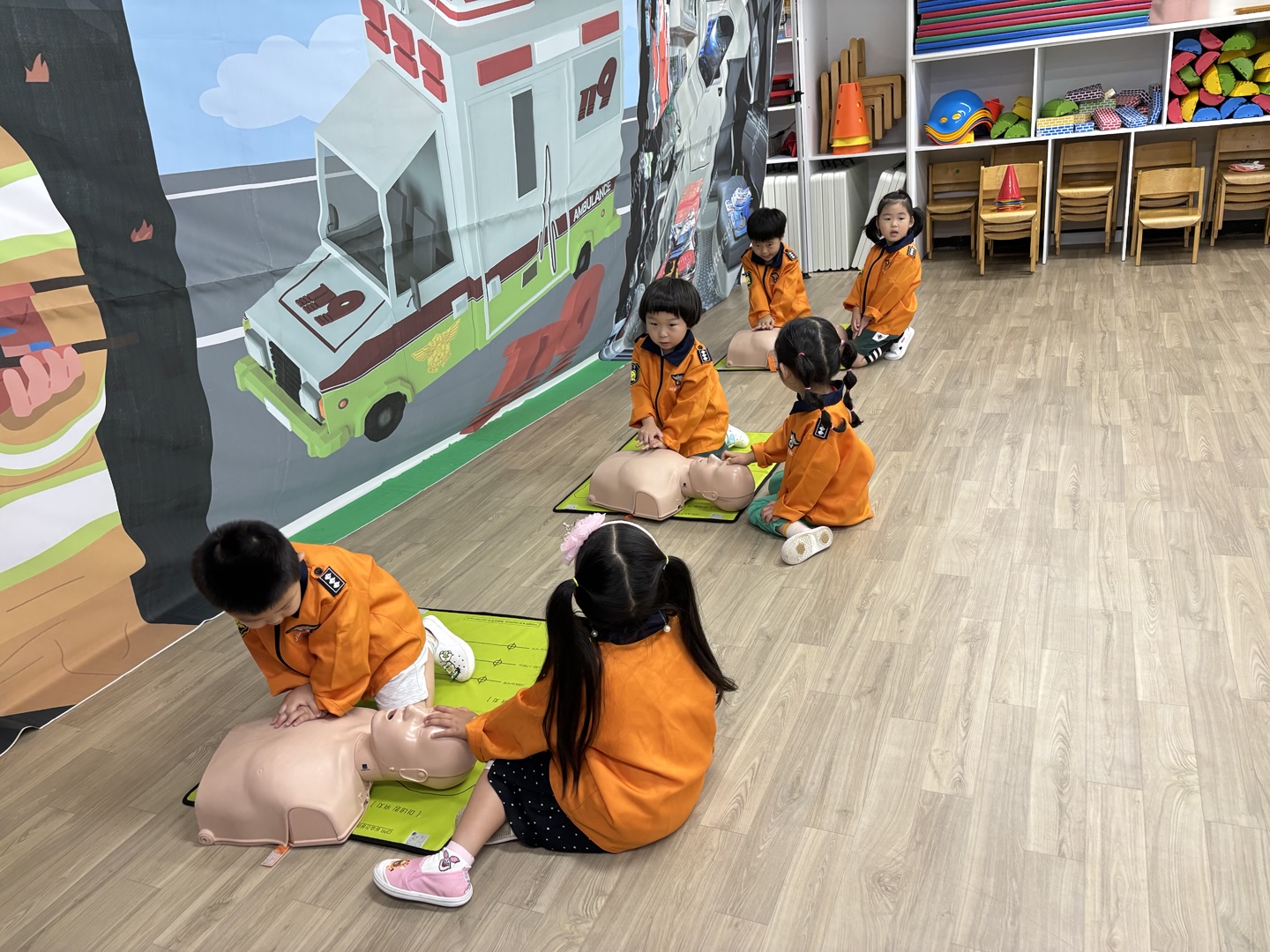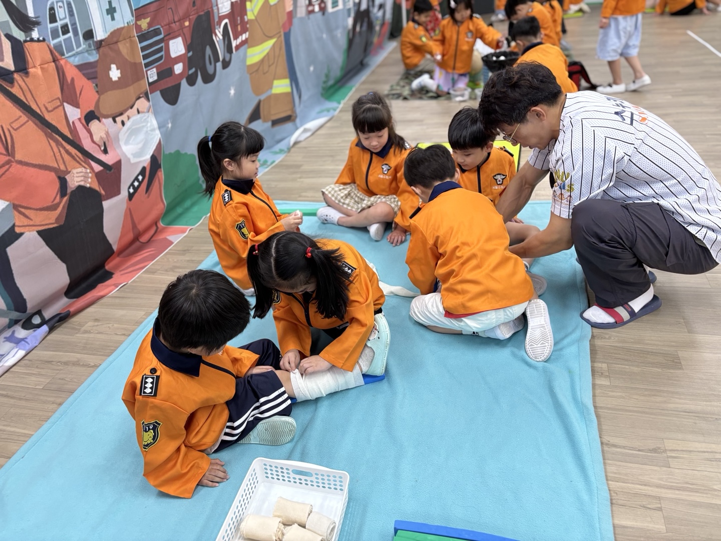 응급구조사 선생님이 직접 유치원을 방문하여 유아들에게 응급구조사의 역할과 응급구조 활동방법을 알려준 후 직접 응급처치, 심폐소생술, 붕대법 등을 경험해 보게 하였습니다.