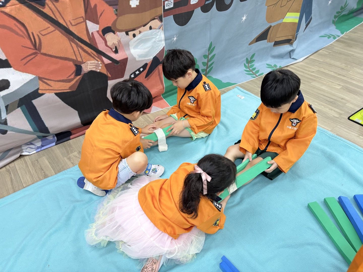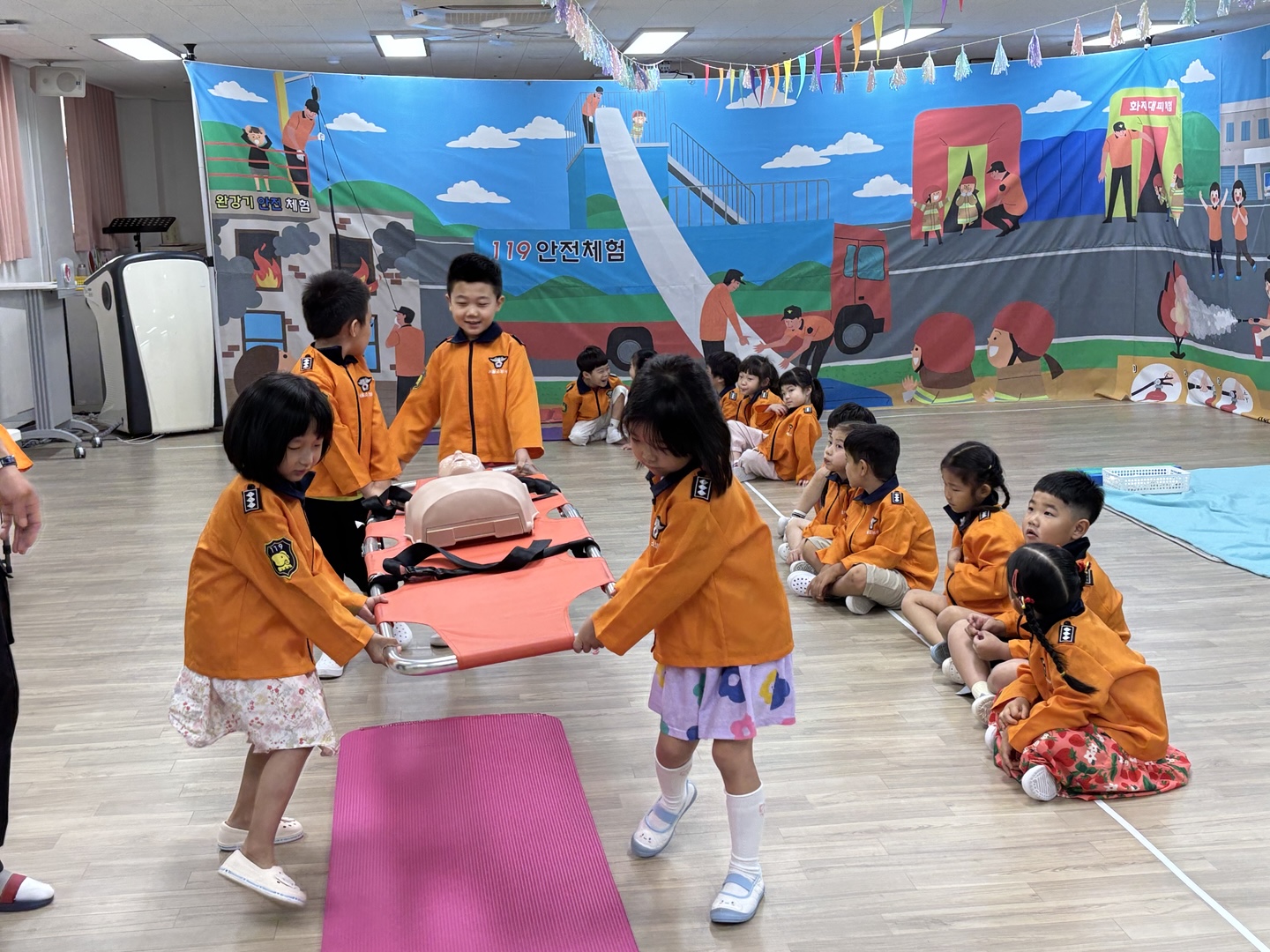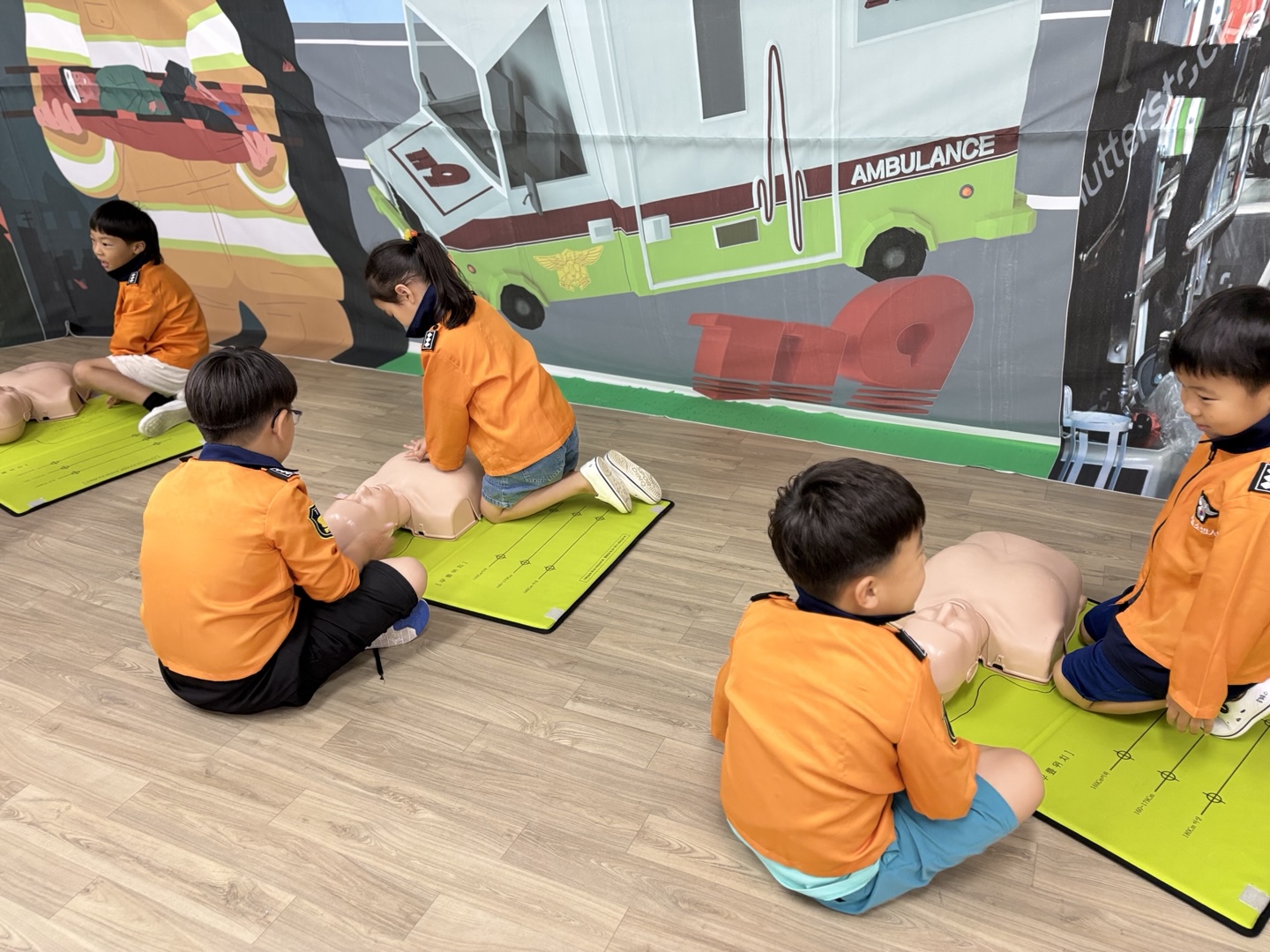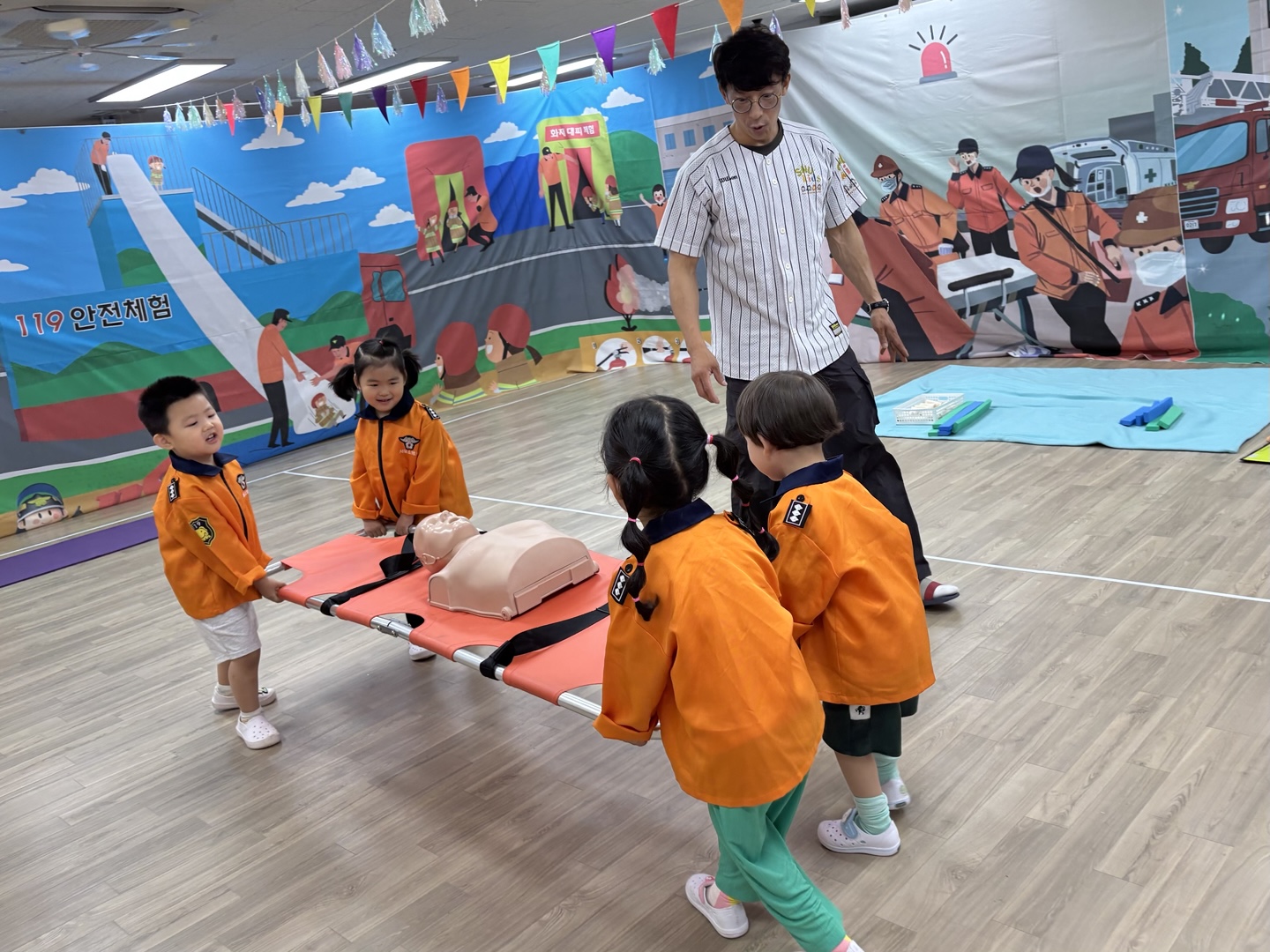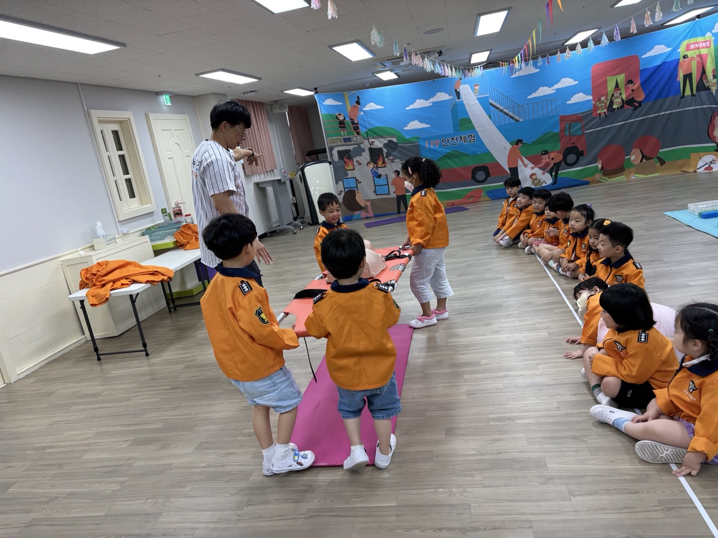 응급구조사 선생님이 직접 유치원을 방문하여 유아들에게 응급구조사의 역할과 응급구조 활동방법을 알려준 후 직접 응급처치, 심폐소생술, 붕대법 등을 경험해 보게 하였습니다.