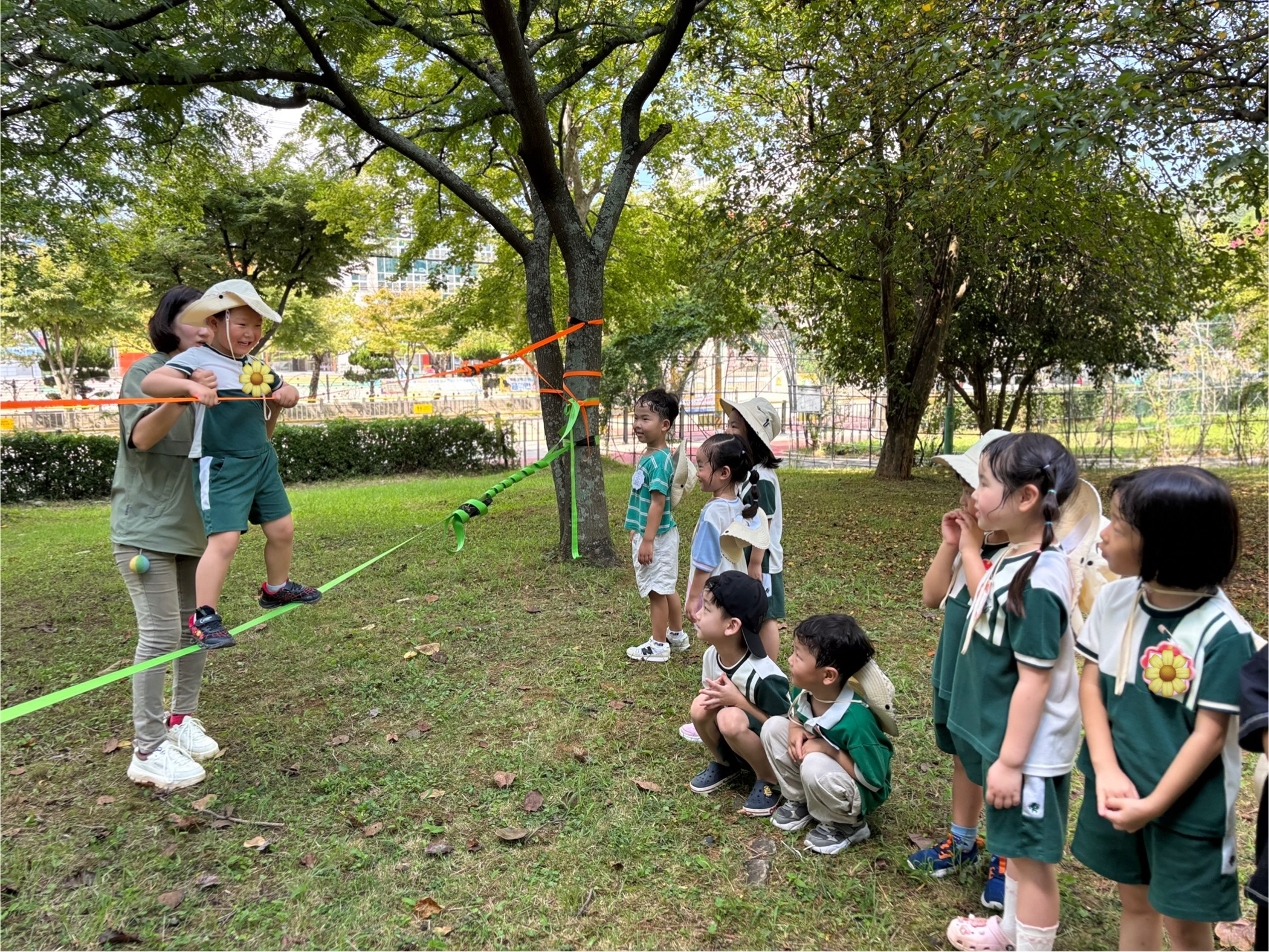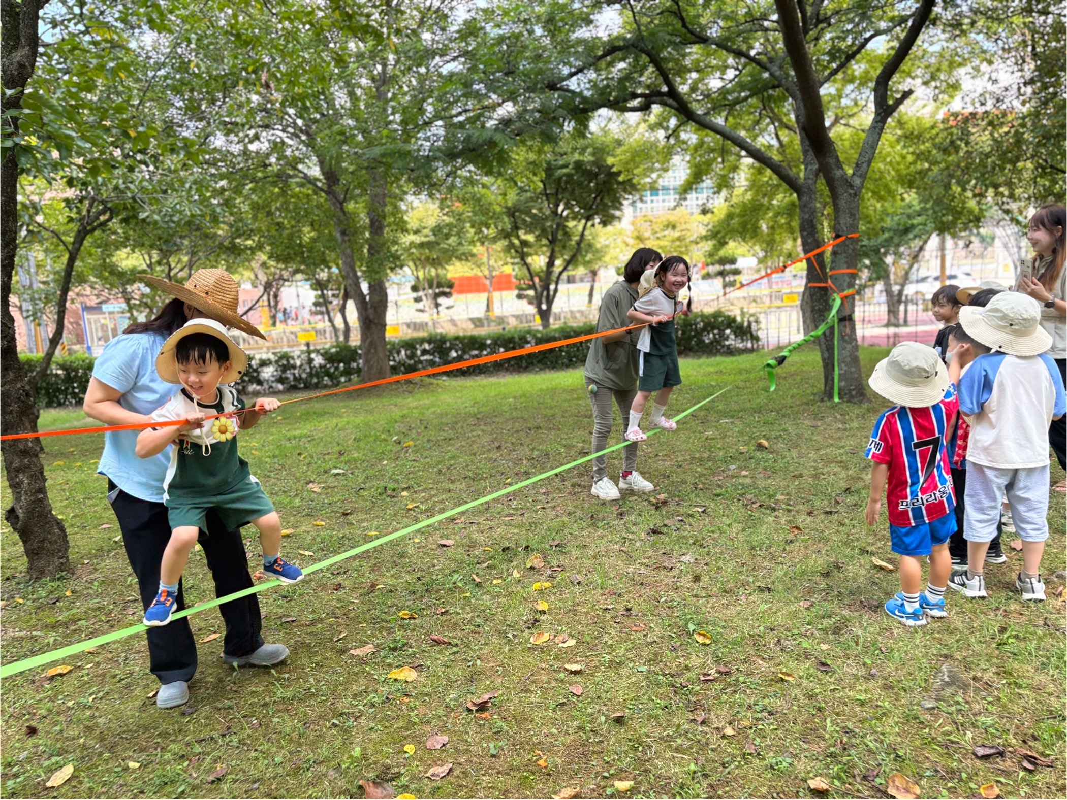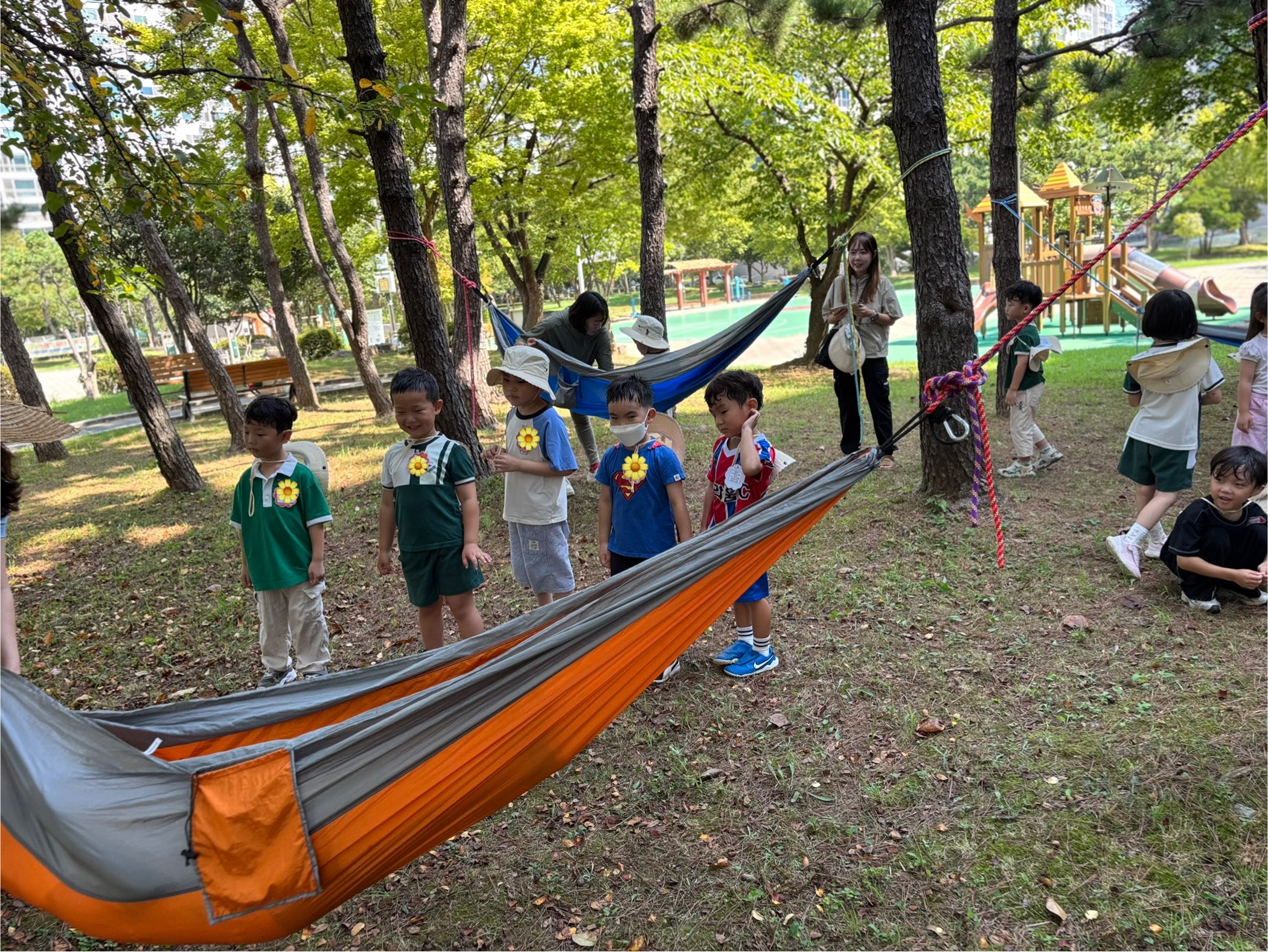 ‘고라니’선생님과 함께 밧줄로 해먹놀이, 그네타기, 나무 오르기를 하며 즐겁게 친구들과 숲놀이 체험을 가져 보았습니다.