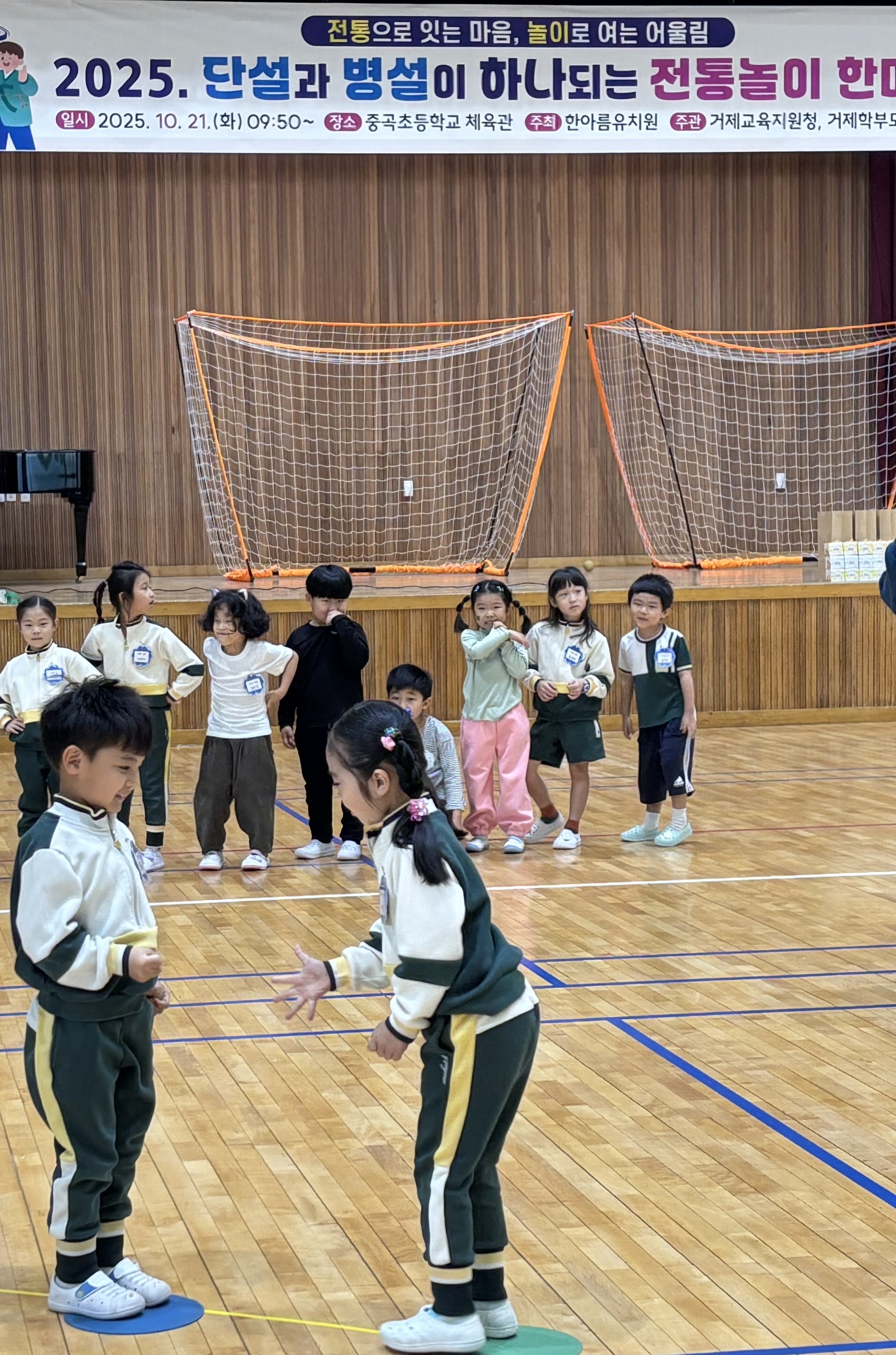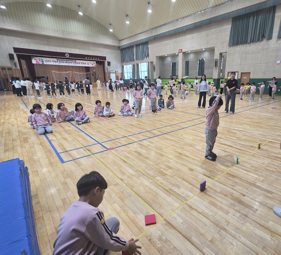 10월 21일(화), 한아름유치원과 장평초등학교병설유치원 유아 80여 명이 함께 중곡초등학교 체육관에서 전통놀이 한마당을 즐겼습니다. 이번 행사는 '개구진아이놀이 연구소' 대표 김주원 강사님의 진행으로 이루어졌으며, 단설 유치원과 병설유치원이 하나되어 우리 전통놀이의 즐거움을 함께 느끼는 뜻깊은 시간이었습니다. 유아들은 돼지피구, 버나돌리기, 달팽이놀이, 비석치기, 단심줄놀이 등 다양한 전통놀이를 체험하며 몸과 마음이 한층 더 성장하는 시간을 보냈습니다.