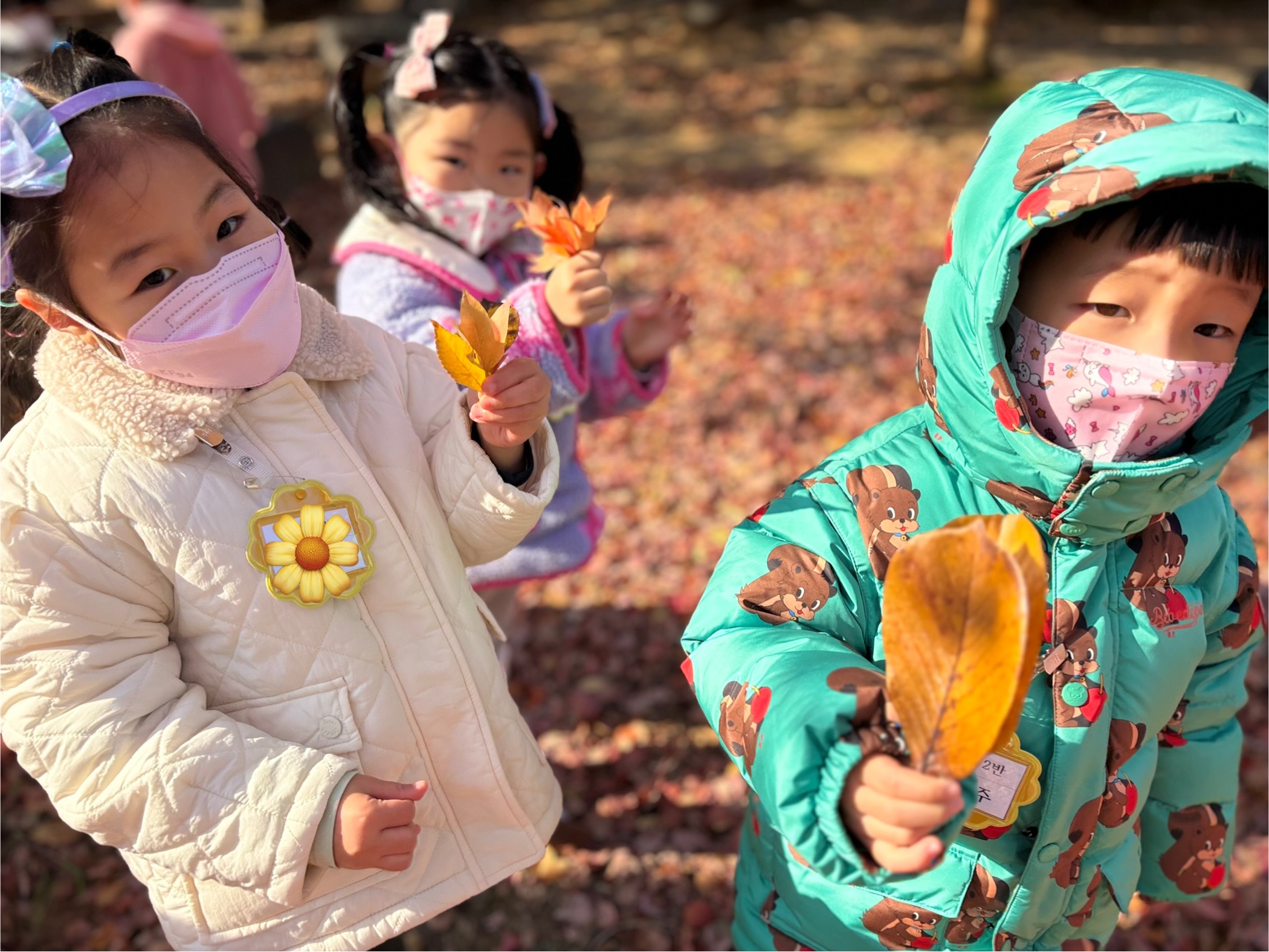 예쁘게 물든 단풍을 주워 하늘로 뿌려보기도 하고, 바스락거리는 낙엽으로 낙엽산과 낙엽 꽃다발을 만들며 가을만의 특별한 놀이를 즐겨보았습니다.
